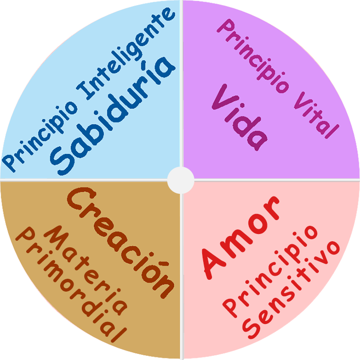 En Dios es: Su Vivencialidad o realidad viviente de plenitud eterna (de donde surge el Principio Vital), Su Creación (de donde surge la Materia primordial y el término de Infinitud), Su Amor (Principio Sensitivo, que en los seres va generando la Sensibilidad, base de lo Emocional), y Su Sabiduría (base del Principio Inteligente).