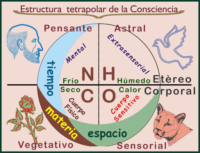 Podemos ver también cómo en la condición humana encarnada con base en el materialismo, el binomio C+N (hemisferio izquierdo de la figura) está en lo Corporal y Mental del sujeto, y el O+H (hemisferio derecho de la figura), en los aspectos emocionales, a través del Agua (H2O) y del propio O como combustible de nutrientes y aporte de Calor.